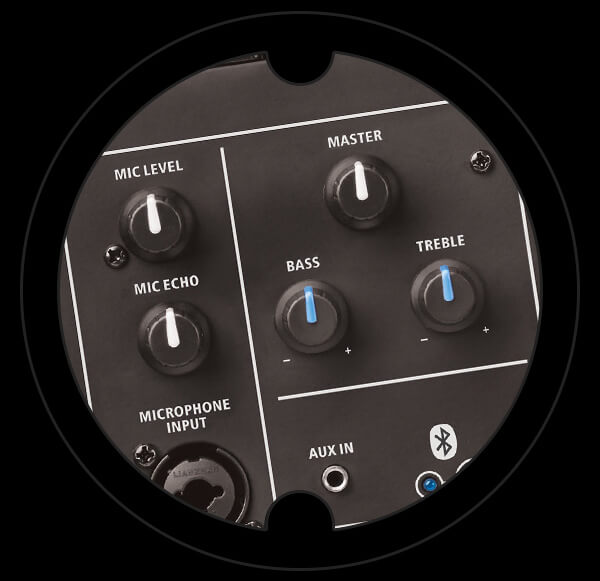 The included microphone and microphone input let you easily amplify your voice, with an adjustable echo effect available for singers. There’s also an aux input for wired connections from smartphones or other audio devices, and bass and treble EQ to perfect your sound.